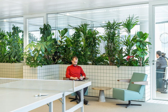 For the open workspaces, they selected Gerrit Rietveld's iconic Press Room Chair in a soft green upholstery.