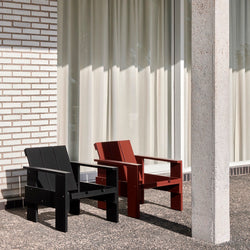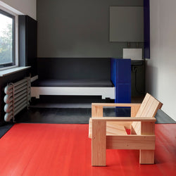 Rietveld Originals makes the series from solid spruce wood which, due to its treatment makes it suitable for indoor and outdoor use. The crate furniture is delivered flat-pack and can be easily assembled. The colour of the furniture is based on a palette that Rietveld used regularly in his houses. The crate series is available in black, white, iron red, a grey shade called London Fog, and of course in lacquered natural pine. Timeless and sustainable design and care for our living environment are central to our operations.