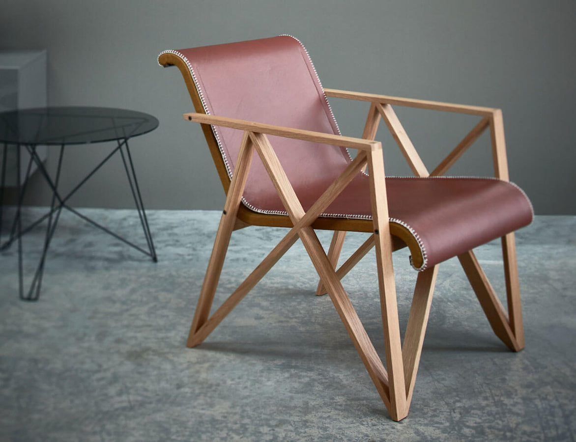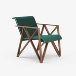 The traditionally made base of the Metz&Co Armchair consists of an ingenious construction of thin slats, in solid oak or solid American walnut, linked by dovetail joints. The seat can be upholstered in a variety of fabrics. The cushion that is stitched onto the seat can be made of felt or leather and comes with a characteristic feston stitch.