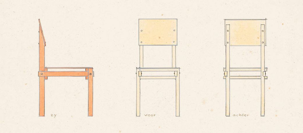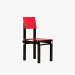 Gerrit Rietveld's Military Chair is part of the Military furniture series Rietveld designed in 1923 for the Catholic Military Home in Utrecht. In this series, he used nuts and bolts for the first time instead of wooden dowels, and he developed a series of very solid designs. The military furniture, which is characterized by the use of square cross ties, is produced in various colors, whereby the tops are always painted in a contrasting color.