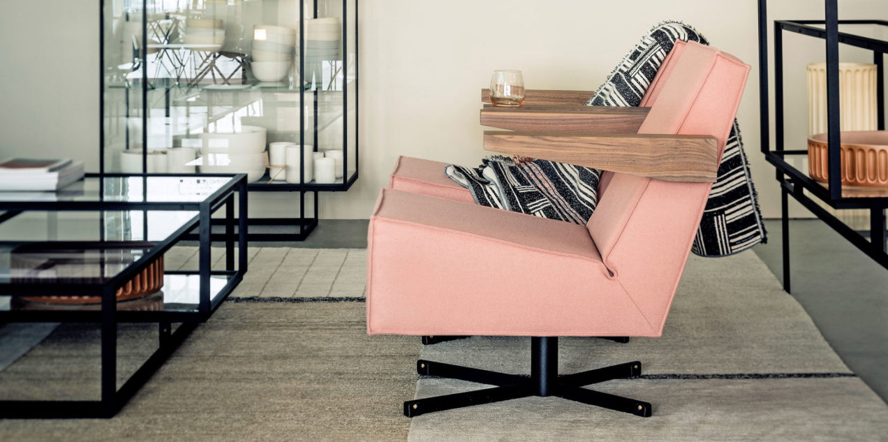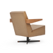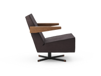 The armchair can be upholstered in different fabrics and leathers. The special finish with double stitching accentuates the sleek, clear division of the armchair. For the armrests you can choose from oak, natural or black stained, or American walnut. The swivel base is available in matt black or stainless steel and is equipped with a return mechanism, so that the Press Room Chair always rotates back to its original position. To protect the floor, the swivel base is equipped with saddle leather foot straps in medium brown, dark brown or black.