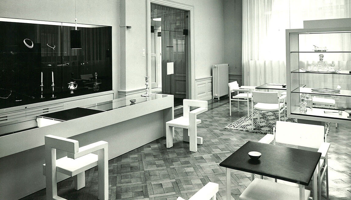 The two mirrored chairs, placed in front of a showcase with jewellery, appealed directly to the imagination. From these chairs customers were able to select their jewellery and wedding rings. This way the chairs also acquired a symbolic meaning: two separate, opposite forms that together form a unity. The asymmetrical chair, which produces a surprising image from every angle, is made up entirely of lines and planes. The Steltman is typical of Rietveld’s design ideas and is now a true design classic!